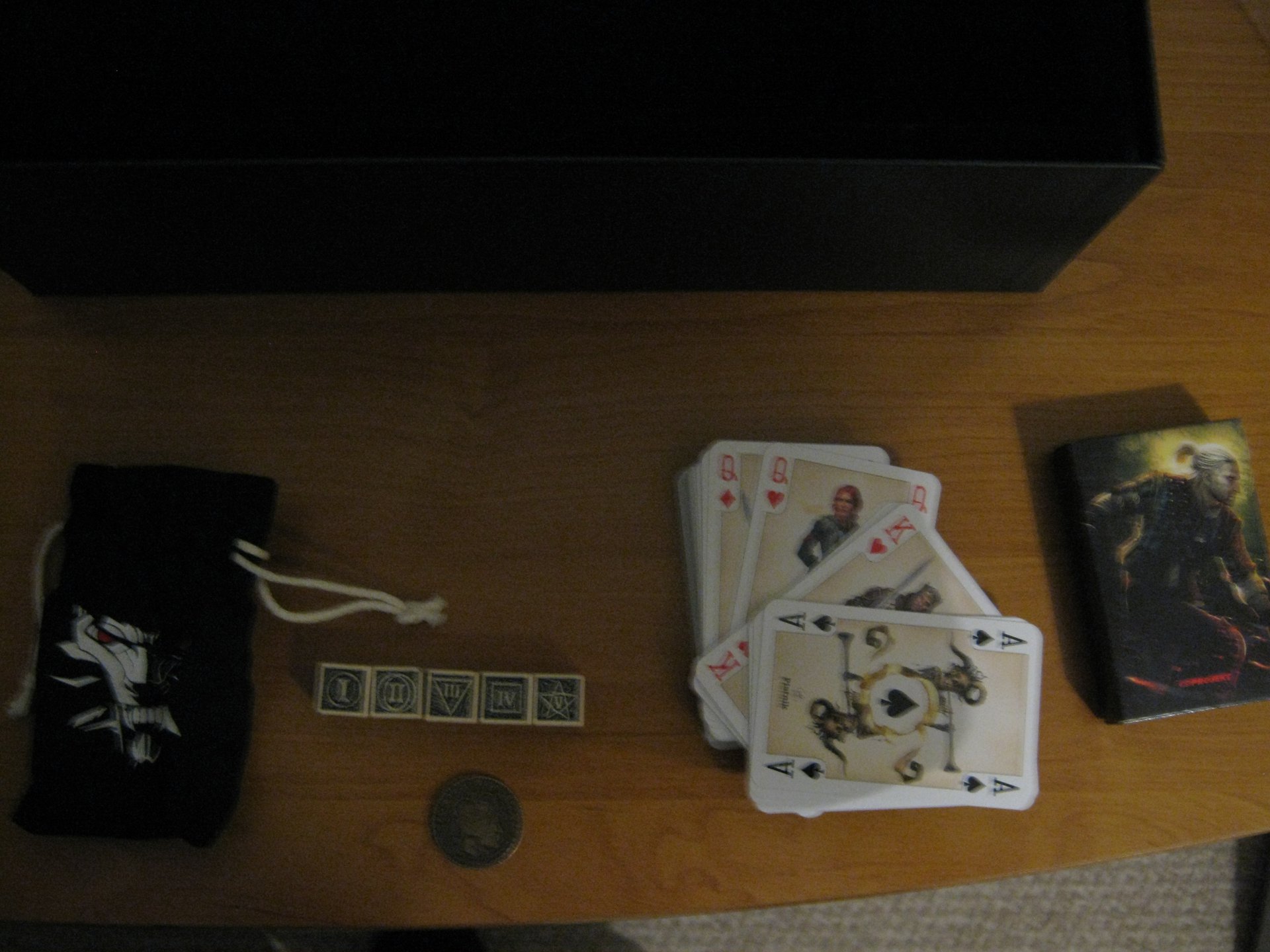 Карты, ксоти и монета крупным планом. Кости очень качественные, а карты стилизированы под мир Ведьмака.