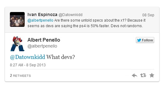 А что, есть какие-то необъявленные технические спецификации Xbox One? Потому что судя по всему разработчики утверждают, что у PS4 есть превосходство в 50% в мощности по сравнению с Xbox One. И эти разработчики не левандосные.