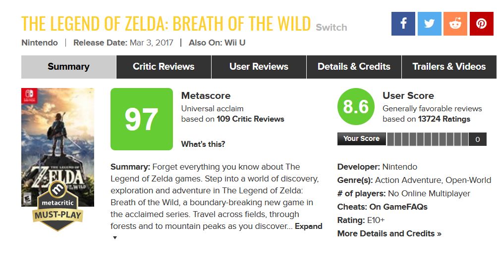 Очевидно, что ограниченные нинтендолямбы не видели нормальных игор, и им любой середняк кажется шедевром на 97/100