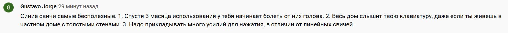 Наслышан о том что ночью на синих свичах лучше не печатать, окружающие будут слышать через стенуsnakesokol писал(а): 27 фев 2020, 20:27А чё все так боятся синих, не пойму. Как по мне, синие самые кайфовые по звуку![]()