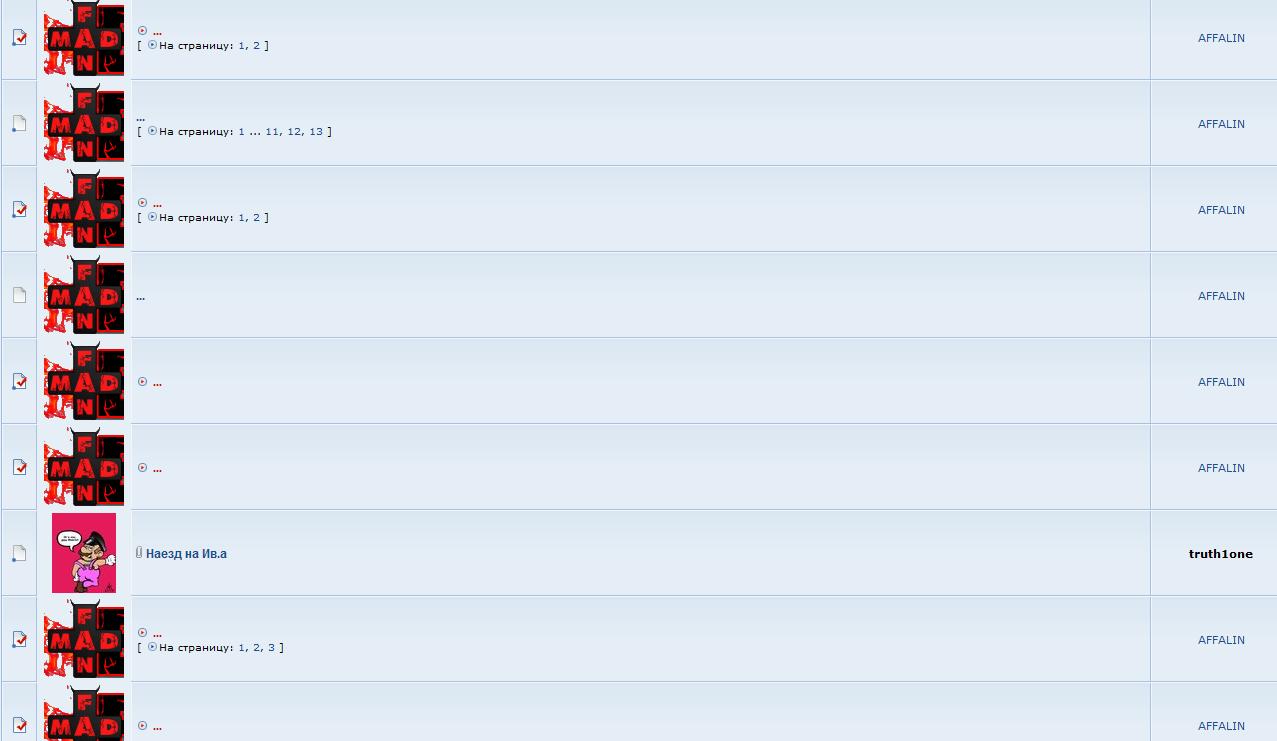 Короче, у меня предложение к модераторам: пацаны, давайте заставим Аффалина назад все темы нормально оформить и написАть в них то, что он стёр или забанить парня на период лечения галоперидолом в психушке.