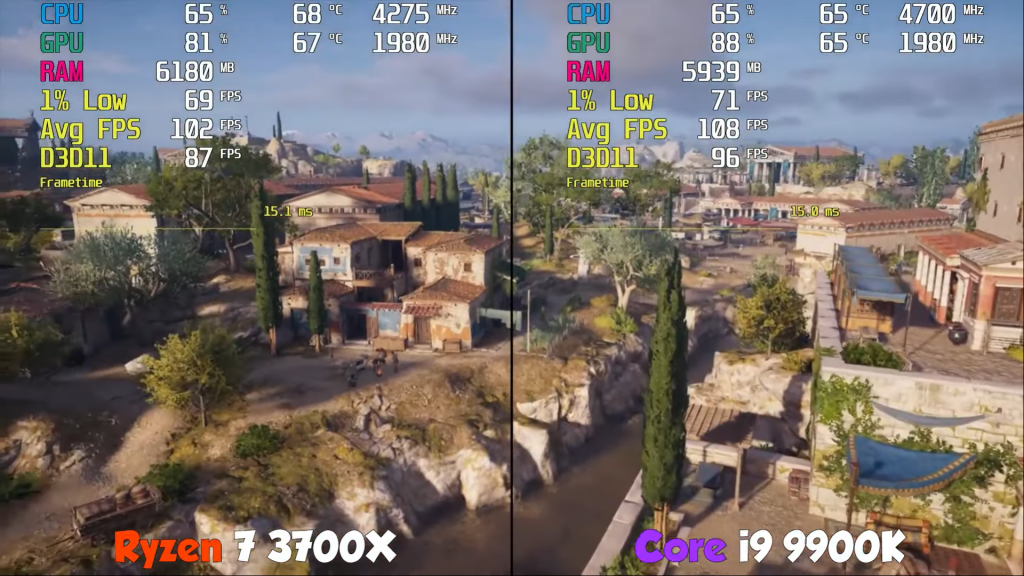 Сам себя сливает. Как ироничноДаже если взять Ryzen 7 3700X, работающий в играх на частоте в 4.1-4.2 ГГц, и поставить ему в пару топовую Nvidia RTX 2080 Ti, чтобы она точно не мешала процессору «раскрыть себя», то он далеко не всегда сможет выдать в играх заветные 120 fps: например, в том же тяжелом последнем Assassin's Creed Odyssey мы скорее видим порядка 100 кадров в секунду с недогрузкой видеокарты, то есть упор идет именно в CPU: