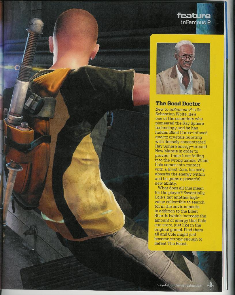 - Собираемые вещи. Nate Fox на Е3 не был готов говорить о данном аспекте игры, но статья PlayStation: The Official Magazine немного приоткрыла завесу тайны. Отдельная часть статьи отведена на представление неизвестного нам до сих пор Dr. Sebastian Wolfe. Доктор живёт в New Marais, и он был одним из учёных, которые ответственны за создание лучевой сферы, которая наделила Коула сверхспособностями. Он отвечал за доставку предметов под названием Blast Cores по всему New Marais, которые, очевидно, дают новые силы Коулу по мере их нахождения. Их будет немного, поэтому можно их рассматривать, как Dead Drops в версии для Infamous 2. Но не волнуйтесь, статья подтвердила, что в Blast Shards вернутся и во второй части. В первой было 350, сколько будет во второй, неизвестно.