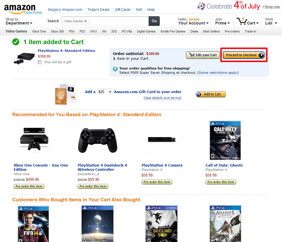 Через меню "Your Account" вы можете попасть на страницу со своими заказами (Your Orders), где увидите только что оформленный заказ на Playstation 4.