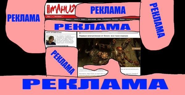 Теперь же поговорим о сайте - все мы прекрасно помним как некогда замечательный сайт игромании преобразился в новую флеш версию и всё превратилось в говно. Было очень неприятно видеть такое убожество на тот момент, ибо старый сайт хоть и был простым, но нёс свою уникальную структуру простоты, удобности и культового дизайна под стилистику журнала. Новый же формат терялся среди конкурирующих аналогов, и абсолютно ничем не выделялся, что только записывало его в серую массу остальных игровых сайтов. И что мы видим сейчас? Тонны, просто тонны рекламы которые не только занимают 80% экранного пространства, но и выступают перед ней! Даже колхозные торрент трекеры и то имеют меньше рекламы, при условии что аудитория у них в десятки раз больше. Так в чем же проблема? В жадности, и глупой организации политики развития проекта.