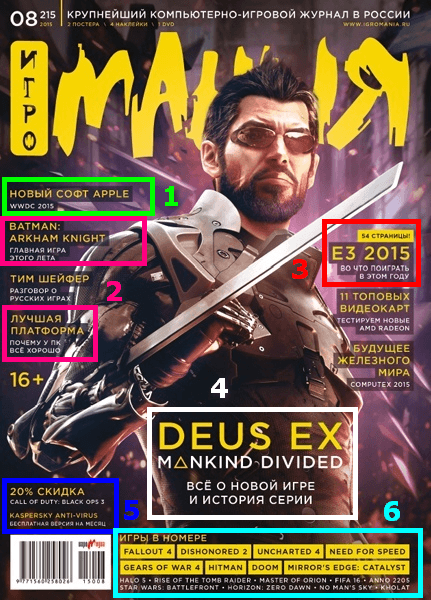 А теперь взглянем на свеженький журнал 2015 года - явно заметно более пустая обложка уже не такая кричащая как из 2007 года, вся информация написана одинаковым тонным шрифтом, включая шильдик Е3 2015, железный цех, обзор на бетмена и т.д.... не хватает только объявлений в стиле "продам гараж, федя, 8 937...", и учитывая рекламную эпидемию с сайтом, кажется что на новых номерах такая реклама скоро появится.