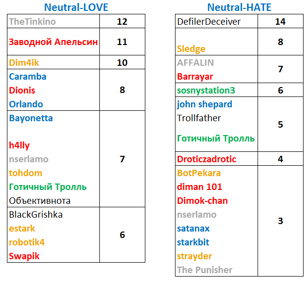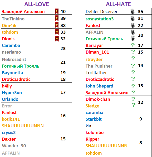 Участники с "?" могут выбрать, носить хейт-медаль или нет.