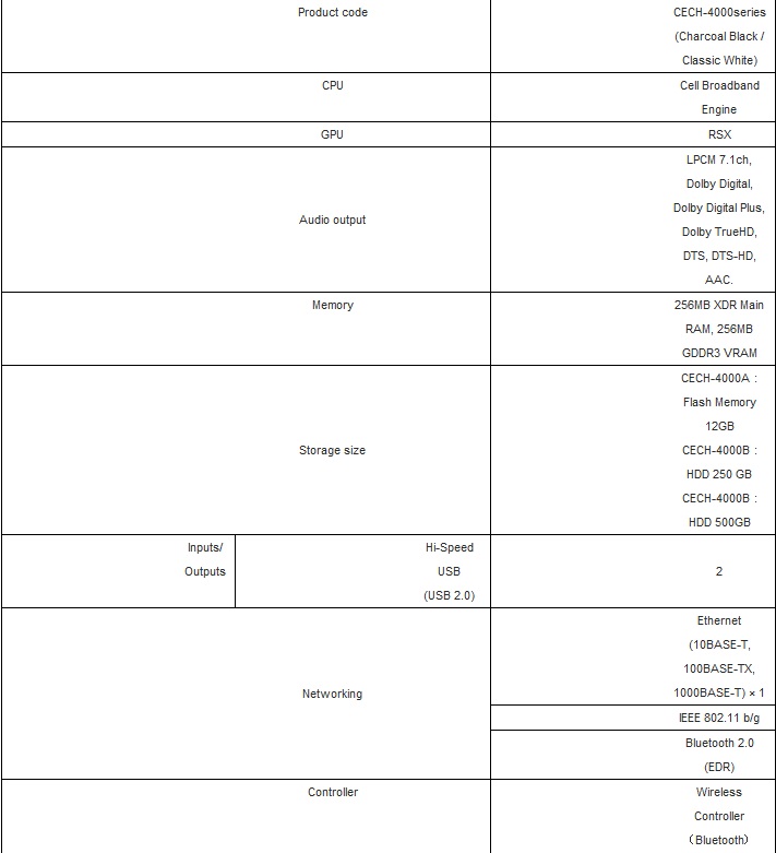 Новая консоль стала на 20-25% тоньше, чем PS3 Slim и почти на 50% легче и меньше по габаритам, чем первая ревизия PS3 Fat c 60 Gb HDD. На территории Японии консоль будет поставляться эксклюзивно в белом корпусе, для всех остальных регионов мира консоль будет только в черном варианте.
