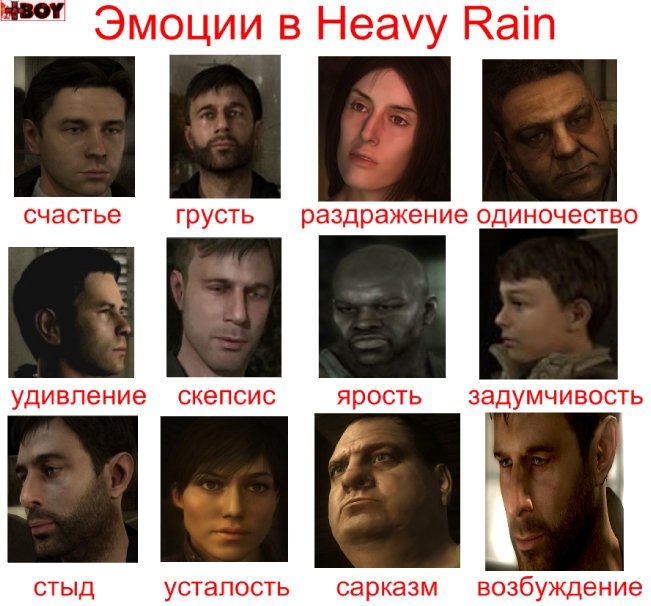 "Такой шедевр доступен только на PS3, больше ни на одной из консолей в мире ( P.S. ага, а Zeebo на такое как будто не способен?). Игра с интересным сюжетом, отличным интерфейсом и очень крутым геймплеем. одни плюсы, минусов нет" - так говорит OPM, ставя 9/10 игре. У нас возникают первые догадки - шедевра не вышло. Ведь официальный журналы всегда завышают оценки, следовательно от обычной прессы нам надо ожидать оценки от 3 до 7. Непорядок. Хотя MadFanboy уже может назвать главную проблему Heavy Rain - эмоции персонажей. Мы тут сделали мини-коллаж, показывающий что мы абсолютно правы в отношении этой игры: