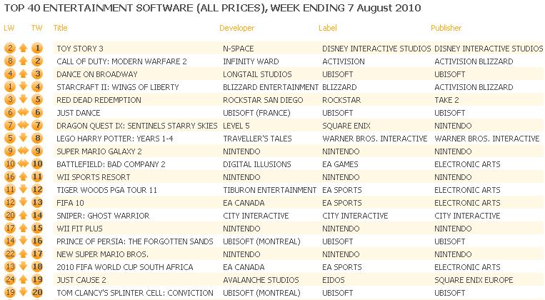 Последний английский чарт показал, что новый оверхайпнутый хит от Blizzard никому не нужен. Игра по продажам во 2 неделю скатилась на 4 место топа и проиграла Toy Story 3, Call of Duty: MW2 (которому уже почти год) и Dance on Broadway.