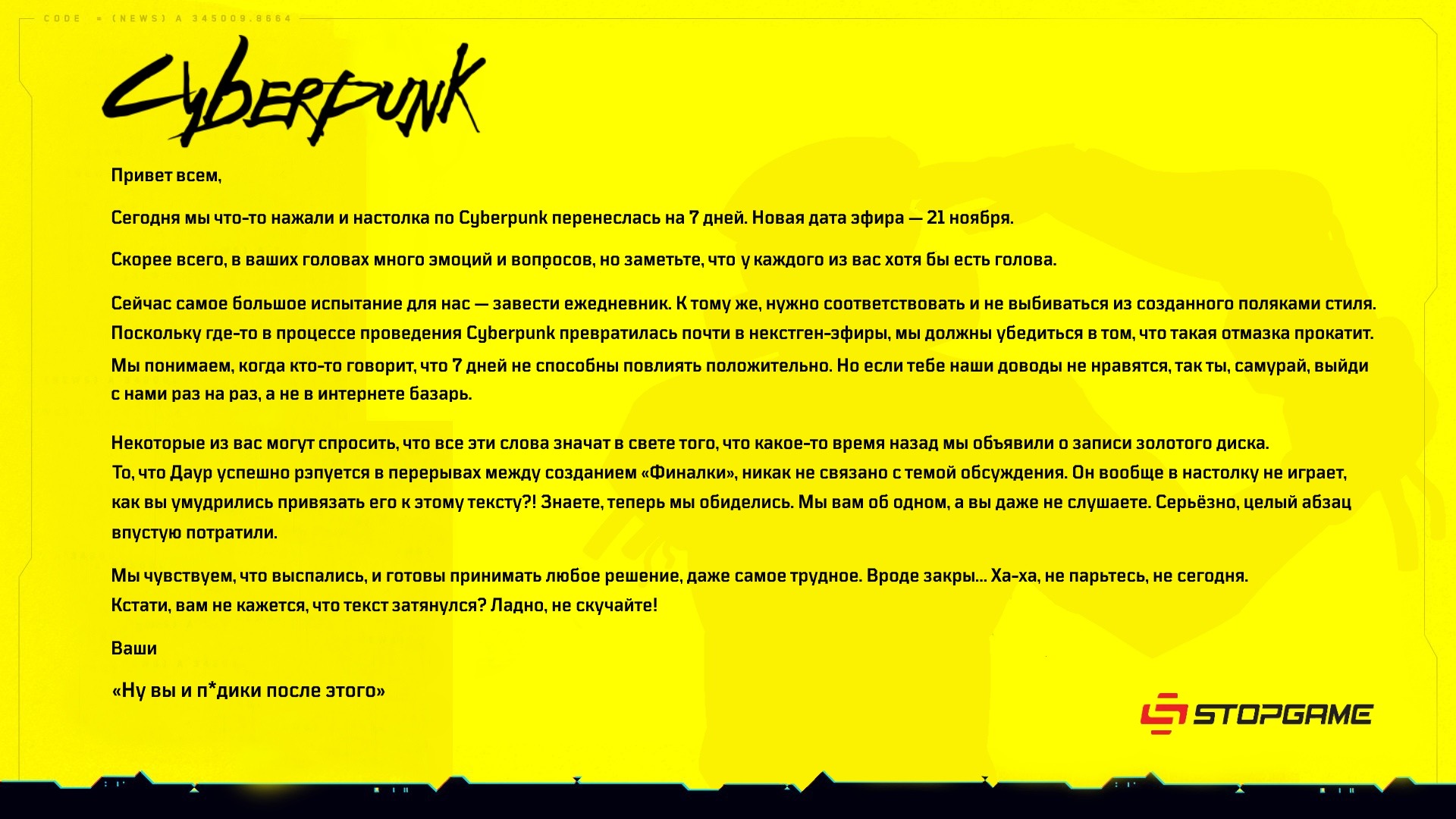 Ожидаем что в ближайшую неделю будет - если будут просто тихо дальше доделывать Киберпанк - значит ждем к Новому Году 10го реально от них такой подарок. На PS5 за 4000руб брать лучшую версию будешь или за 2000 версию 1060жирафа?Mgs Maslorez писал(а): 14 ноя 2020, 16:31Привет, ты вернулся?Ожидаем что в ближайшую неделю будет - если будут просто тихо дальше доделывать Киберпанк - значит ждем к Новому Году 10го реально от них такой подарок.