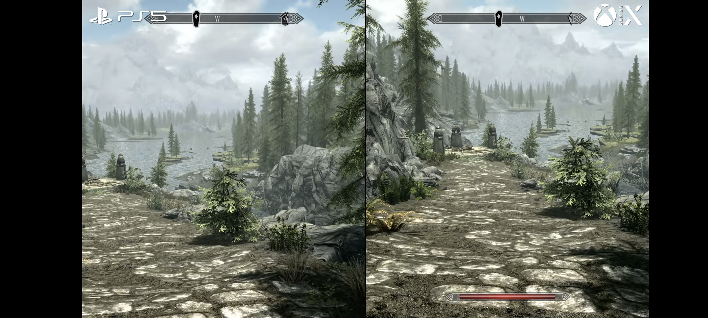 - На Xbox Series X игра работает в динамическом 4K-разрешении, из-за чего в некоторых моментах во время пролога Skyrim выглядит мыльнее;