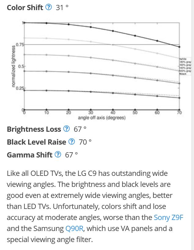 Like all OLED TVs, the LG C9 has outstanding wide viewing angles. The brightness and black levels are good even at extremely wide viewing angles, better than LED TVs. Unfortunately, colors shift and lose accuracy at moderate angles, worse than the Sony Z9F and the Samsung Q90R, which use VA panels and a special viewing angle filter.