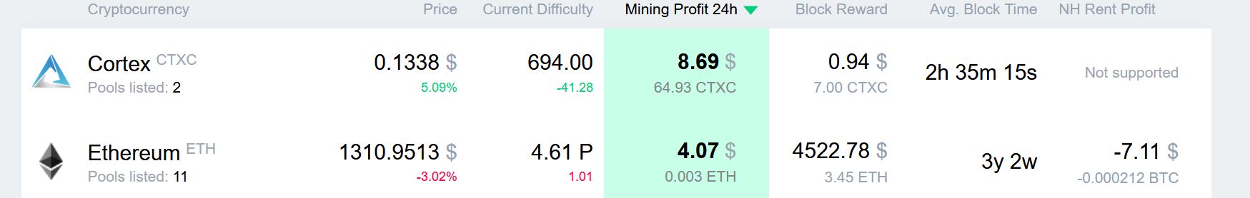 Поставил ещё PhoenixMiner с таблеткой OhGodAnETHlargementPill2, чтобы врубать эфириум если кортекс проседает.