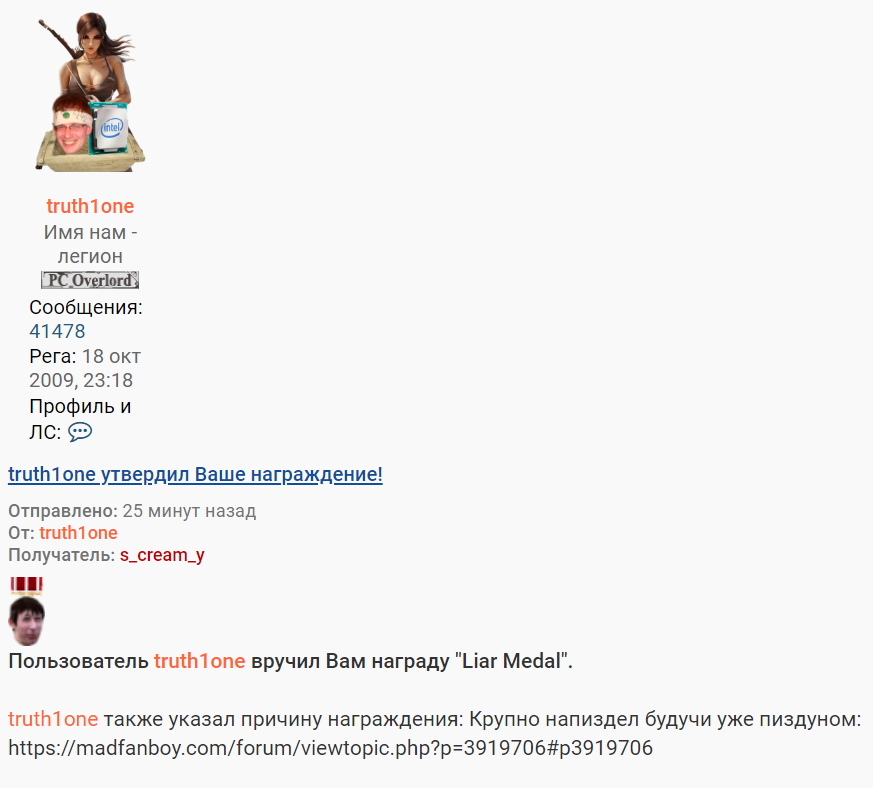 truth1one писал(а): 20 мар 2020, 15:45s_cream_y, медалированный пиздун который читерит в бенчах у нас ты. У меня средний фремрейт с лучами на ультра 56 фпс, это доказанный факт![]()