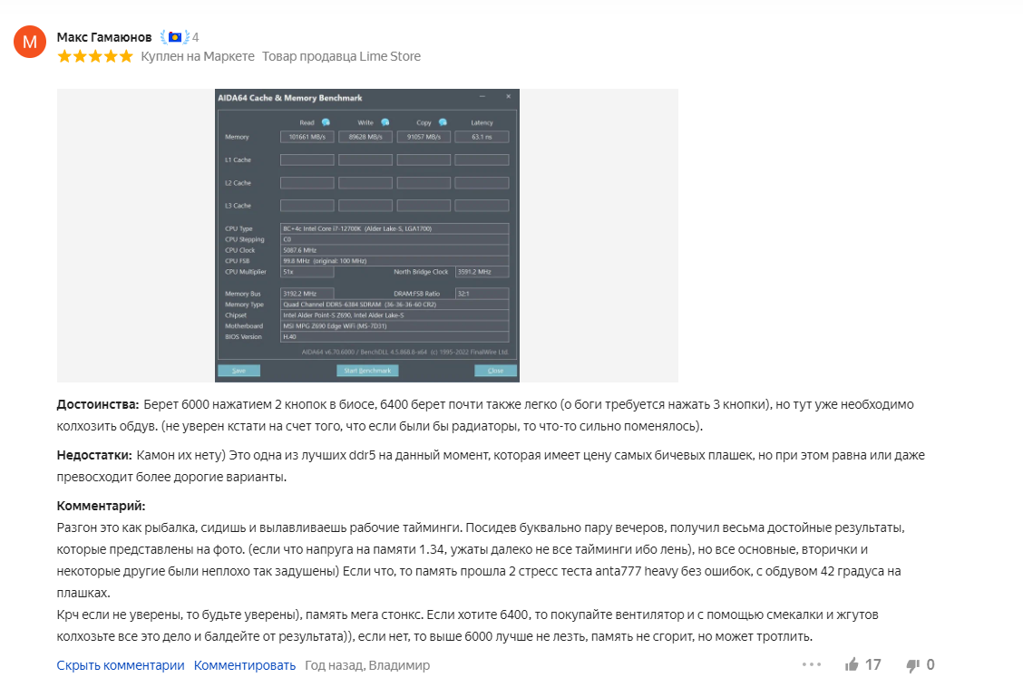 12400 держит 6100 по памяти, материнка держит 6000, сама озу гонится до 6000 или даже больше.kvidix писал(а): 18 ноя 2023, 17:57Там нормальная мать и проц, а не бомжеговноChris писал(а): 18 ноя 2023, 16:36kvidix, https://market.yandex.ru/product--pamia ... 78/reviews