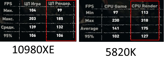 10980xe говнина с лучшей памятью получила позорные 135 фпс на 18 ядер, а по максимальному соснула почти в 2 раза у древнего 5820k на 3.6ггц