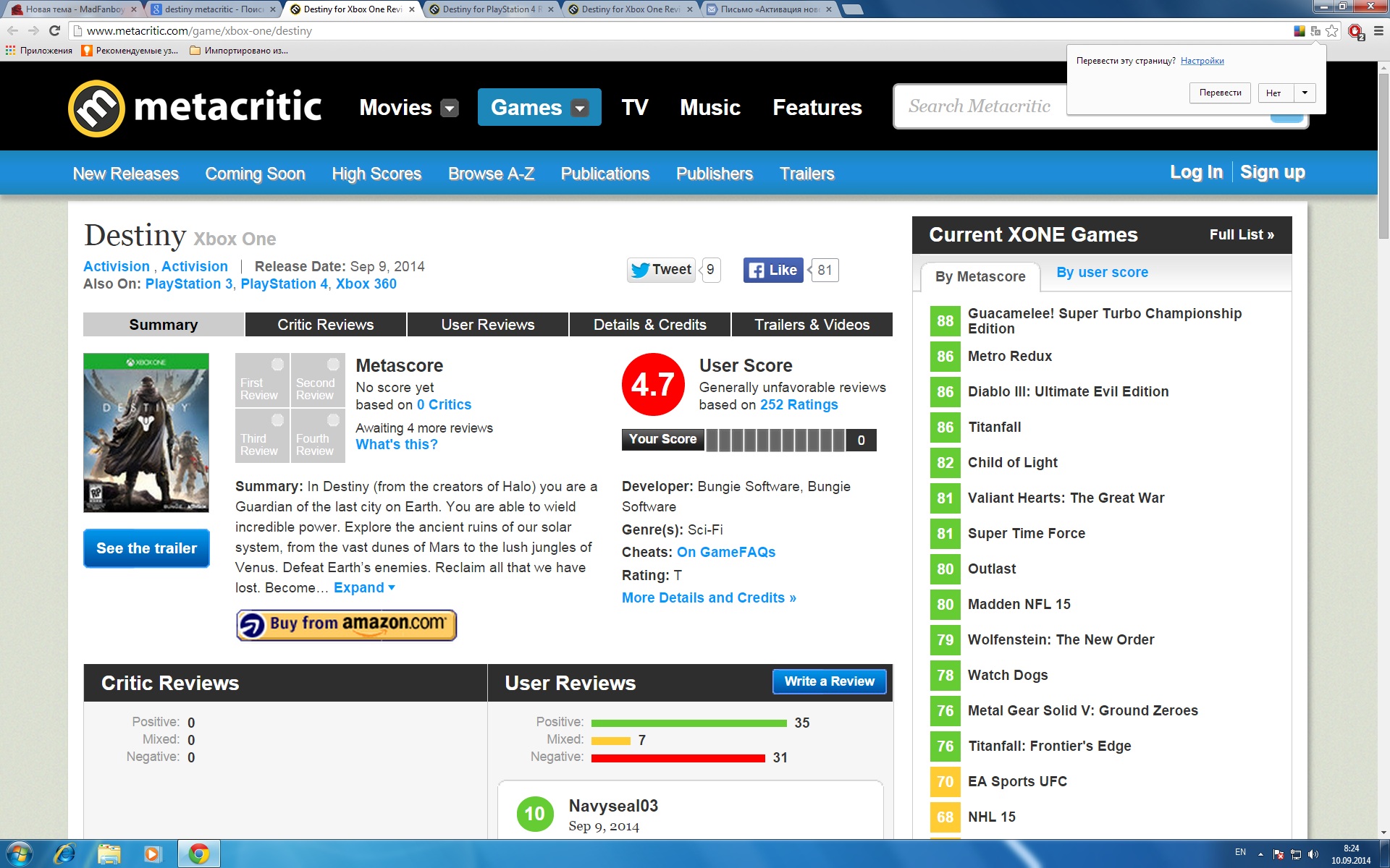 Смотрим юзерские отзывы по Destiny за день на метакритике. Игра стартовала на обоих коснолях в одинаковое время вчера.