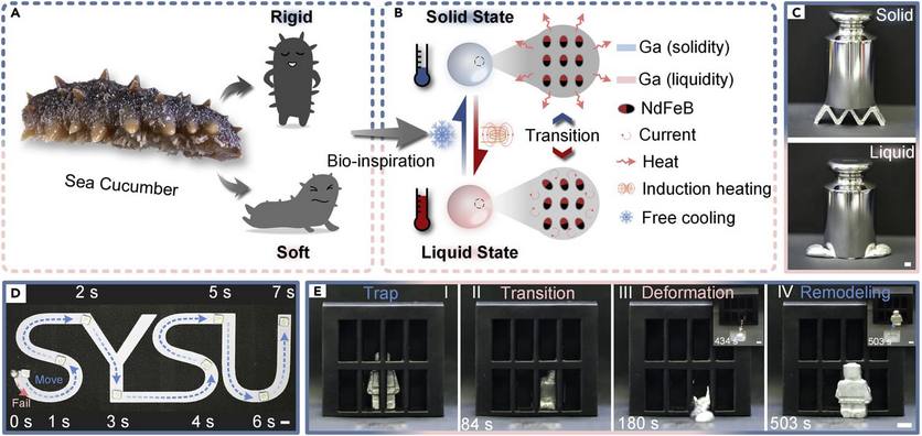 Для создания жидкого металла с подобными свойствами инженеры добавили магнитные частицы из неодима, бора и железа в галлий (металл с температурой плавления 29,76 °С). Комбинация этих частиц обеспечивает «переключение» между агрегатными состояниями и управляет их движениями. За счёт чувствительности к переменному полю с помощью индукции металл легко нагревается, и происходит его фазовый переход. Кроме того, такими роботами можно манипулировать с помощью магнитов.
